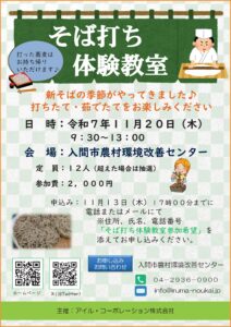 氏名、住所、電話番号、【そば打ち体験教室参加希望】を添えて
